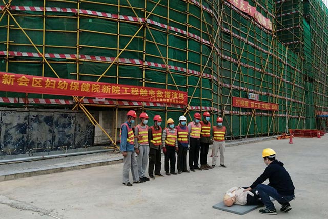 為了保障作業(yè)人員安全和財產(chǎn)免受損失,加強員工的觸電救援、消防意識,提高意外事故的搶險救援和自我防范能力,熟悉觸電救援、消防應急方法。根據(jù)廣東省市場監(jiān)管局印發(fā)《關于全力推動市場主體復工復產(chǎn)復市的通知》,結合防控疫情的形勢,把復工復產(chǎn)工作抓實抓細抓落地,做到抗擊疫情和經(jīng)濟發(fā)展兩手抓、兩不誤。2020年4月13日,廣東金輝華集團有限公司江門區(qū)域公司在新會區(qū)婦幼保健院新院工地舉行作業(yè)現(xiàn)場應急處置演練,主要