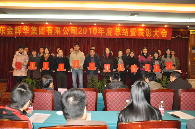 總結大會由集團副總裁陳維民主持。會上,集團董事長李甫發表新年致辭,總裁張國球作了《金輝華,滿懷豪情再出發》的2010年終總結及2011年工作計劃匯報講話,重點對企業申報特級、強化團隊建設、進一步明晰、健全和完善業務工作流程和抓緊科研項目實施,對2011年生產經營工作進行了安排和部署。黨委書記張解矛和開平國泰康庭置業有限公司總經理周雪峰分別作了工作發言。最后,開平市住房和城鄉建設局局長吳進進對金輝華集團一年來的工作作了肯定、贊揚和勉勵,并祝金輝華集團在新的一年團結一致,揚起創新的風帆,在和諧發展的同時,2011年勝利沖刺特級資質企業。