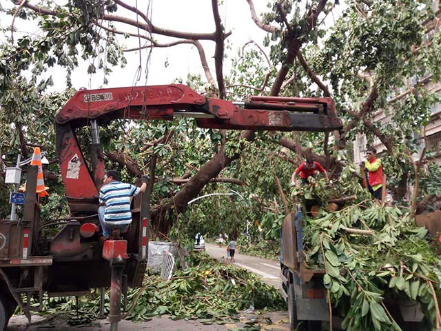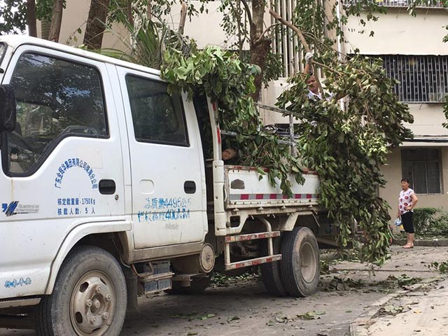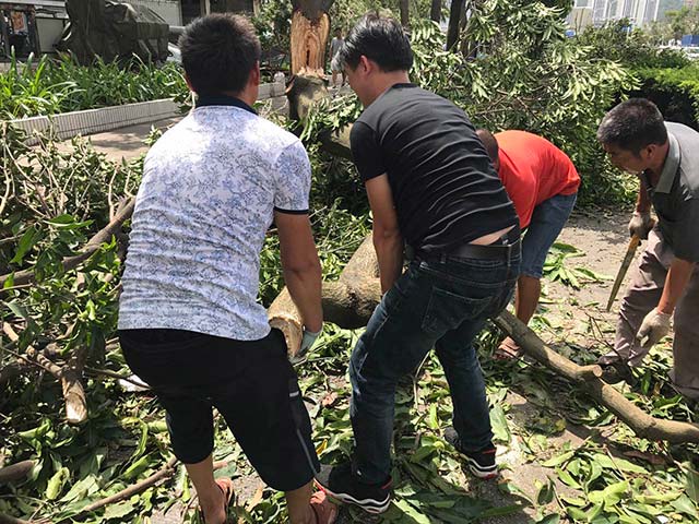 2017年8月23日中午12點50分,第13號臺風“天鴿”正面襲擊珠海市,大批樹木被攔腰折斷或連根拔起,造成大部分主干道堵塞,嚴重影響當?shù)鼐用窆ぷ骱蜕睢!疤鞛?zāi)無情人有情”,我集團珠海公司在獲悉災(zāi)情后,迅速行動,組織人員和車輛,全力以赴針對突出的受阻道路進行清理工作。在安平路、桃園路、海虹路、東風路等路段,隨處可見殘樹斷枝錯亂橫陳,珠海公司員工與當?shù)鼐用褚黄鹎鍜呃嵋茦淠尽V钡皆撀范吻逭瞎ぷ魍瓿桑缆方煌ɑ净謴?fù)。