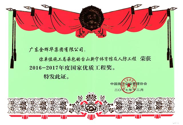 2017年 12月13日,由中國施工企業管理協會主辦的“2016-2017年度國家優質工程獎總結表彰大會”在北京人民大會堂舉行。廣東金輝華集團有限公司“江門市中心醫院外科住院大樓工程”和“臺山新寧體育館及人防工程”,榮獲國家優質工程獎兩項。