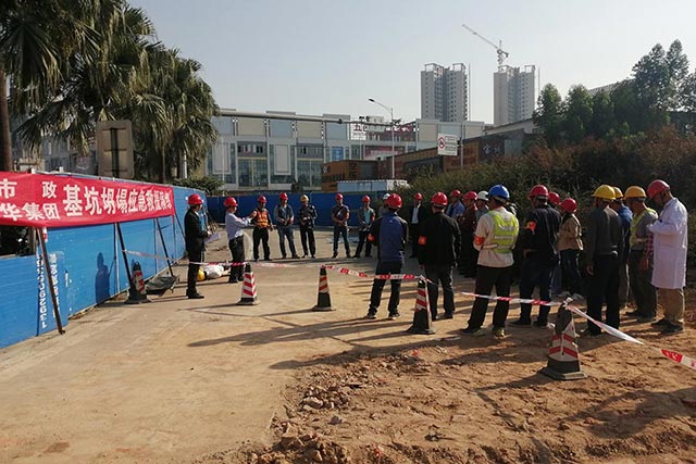 2019年11月21日(星期四)早上9:30,廣東金輝華集團公司承建的江門市供水管網擴容改造建設項目勘察設計施工總承包工程,在江門市蓬江區(qū)奇榜片區(qū)五邑機電城旁施工現(xiàn)場,進行”基坑坍塌應急救援演練”活動。演練的目的:1、評估安全事故的應急預案的響應啟動執(zhí)行力和響應及時性,分析預案內容的針對性和真實性;2、檢驗應急響應人員對應急預案的了解及實際操作熟悉能力,對應急物資的使用熟悉程度,評估應急知識培訓的效果,分析培訓需求,同時作為一種培訓手段,通過調整演練難度,進一步提高應急響應人員的綜合素質能力,提高全員安全意識。