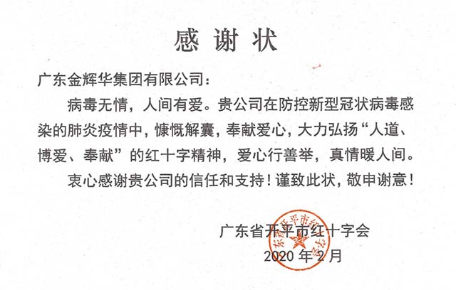 今年春節,一場突如其來的新型冠狀病毒感染的肺炎疫情牽動著每一個人的心,更牽動著每一位金輝華人。新型冠狀病毒感染的肺炎疫情(簡稱“疫情”)發生后,在習近平總書記:生命重于泰山,疫情就是命令,防控就是責任的指引下,并在開平市新冠肺炎疫情防控指揮部的統一部署下,開平市紅十字會,慈善會共同發布了《開平市紅十字會、開平市慈善會關于募集我市疫情防控工作資金和物資的倡議書》。廣東金輝華集團有限公司積極響應、踴躍捐贈,體現了本公司“一方有難、八方支援、同舟共濟”的優良傳統。2020年2月3日,公司定向捐贈長沙街道辦事處10萬元,開平市20萬元,合計30萬元用于新冠肺炎疫情防控。用自己的方式,傳遞著建筑人的溫度、溫情和專業力量,展現民營企業的責任擔當,全力做好疫情防控工作,為開平的疫情防控全局作出了積極貢獻。